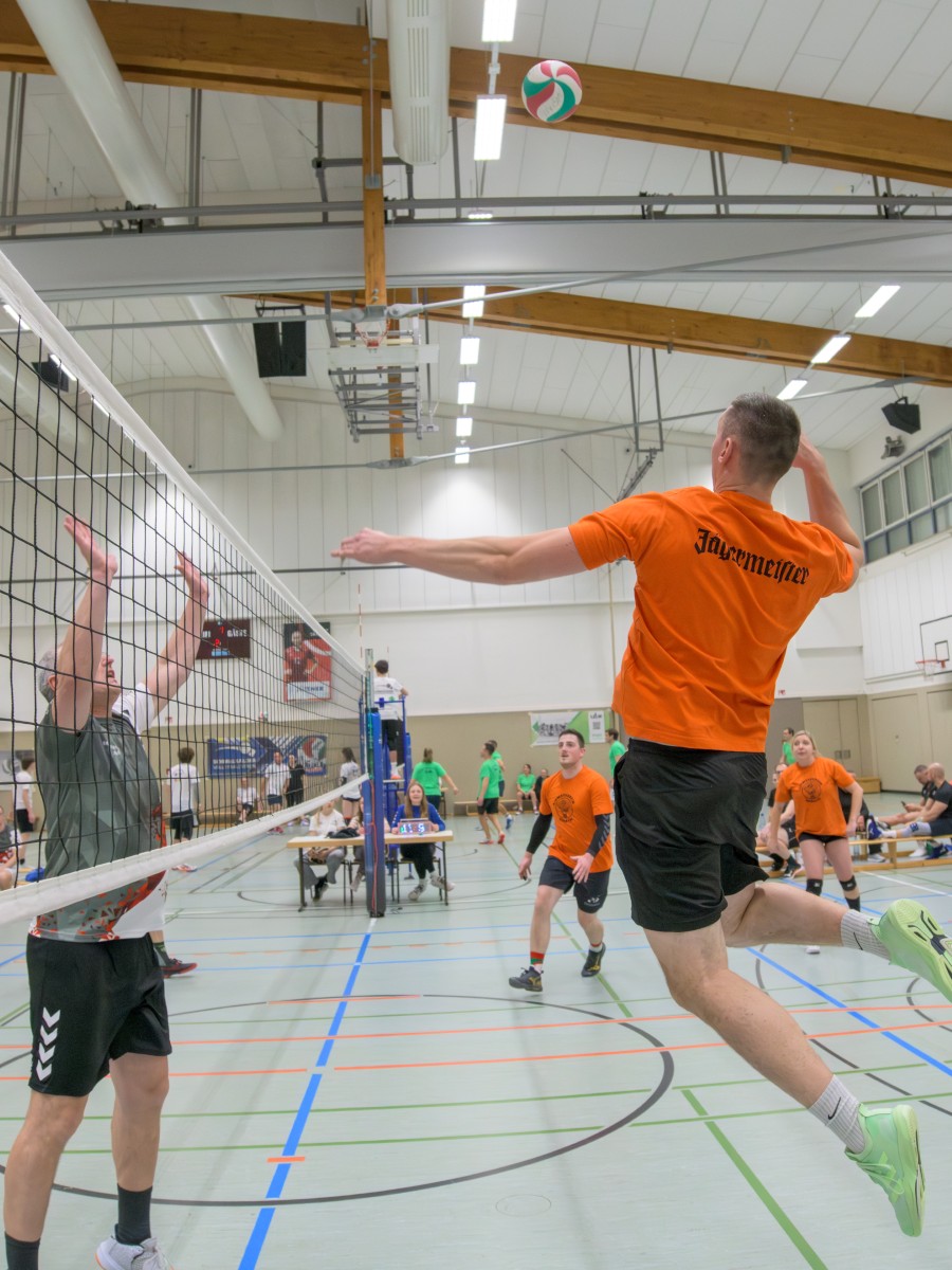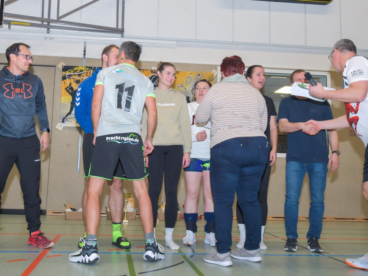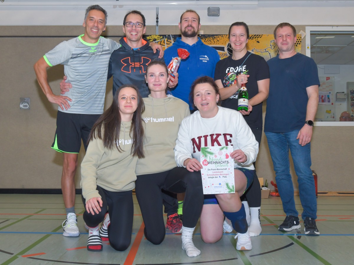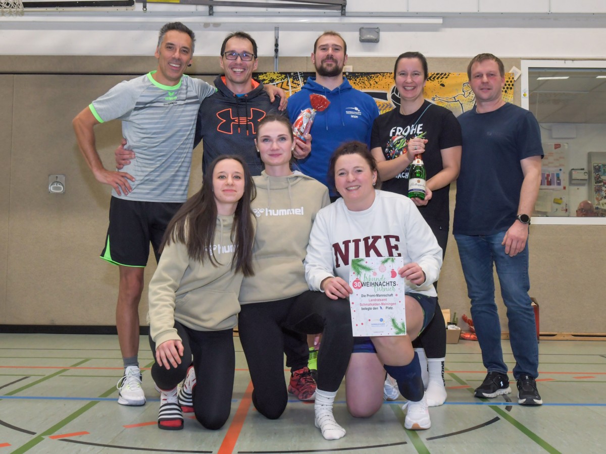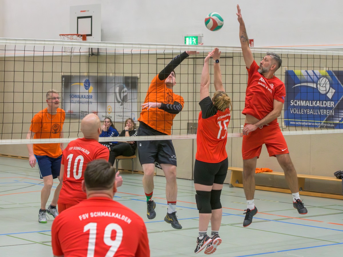 „Das Ziel lautet: Spaß haben“, fasste FSV-Fußballer Fiete Müller das Motto des Abends, aber eigentlich des gesamten Wochenendes zusammen. Nach herzlichen Worten der Begrüßung vom Micha Henke, Christian Stückrad (Präsident des Thüringer Volleyball-Verbandes), Schmalkaldens Bürgermeister Thomas Kaminski und Landrätin Peggy Greiser, ein paar Gastgeschenken für den Schmalkalder VV sowie einem kleinen Weihnachtsständchen aller Anwesenden ging es in vier Staffeln zu je drei Teams ans Netz, wo sich so mancher durchaus ehrgeizig zeigte. „Wir sind hier nicht angetreten, um Letzter zu werden. Das wurden wir früher oft genug“, zeigte sich Mario Liebaug vom Fußball-Schiedsrichterteam des KFA Rhön-Rennsteig ambitioniert. Am Ende erreichten sie immerhin Platz drei.