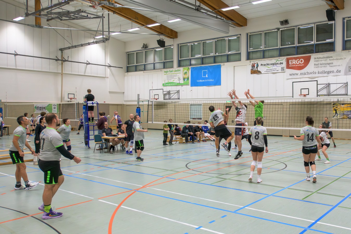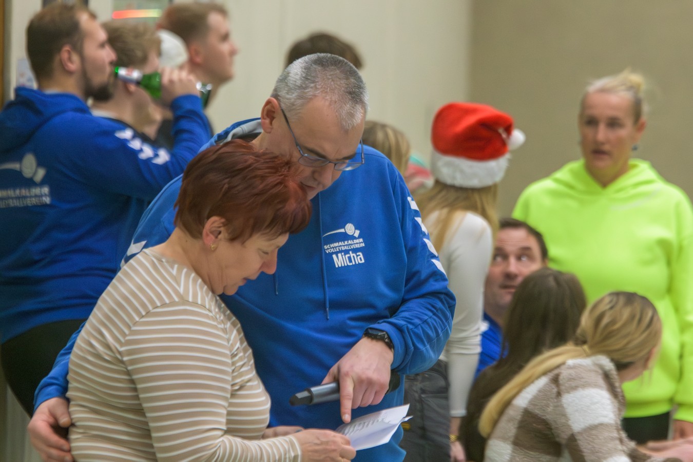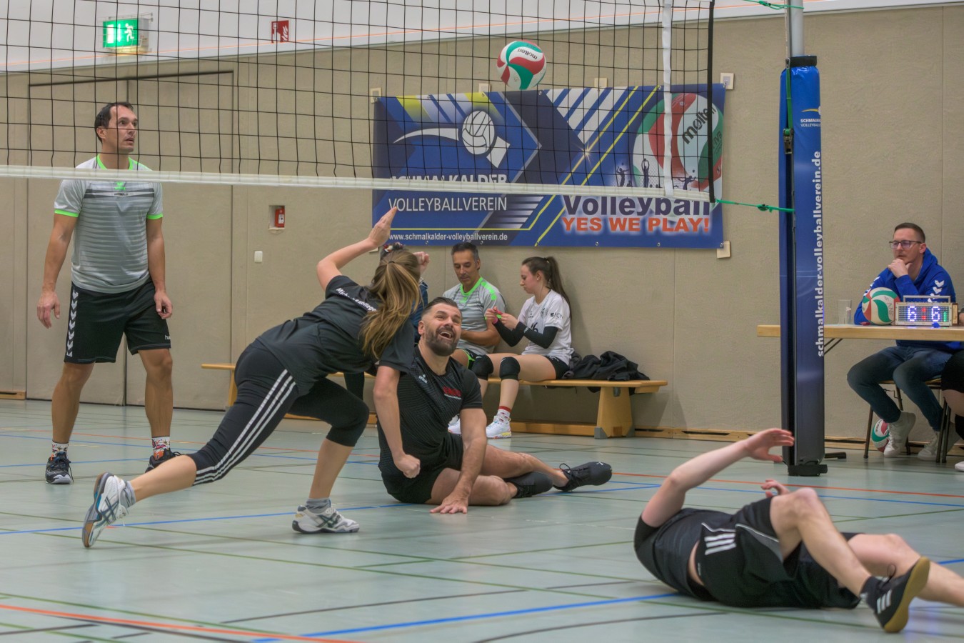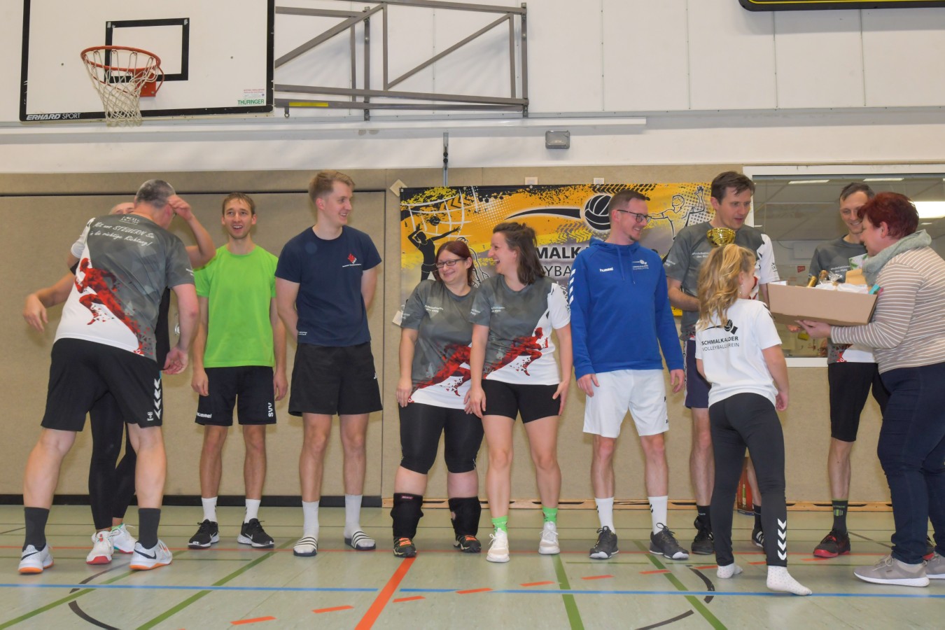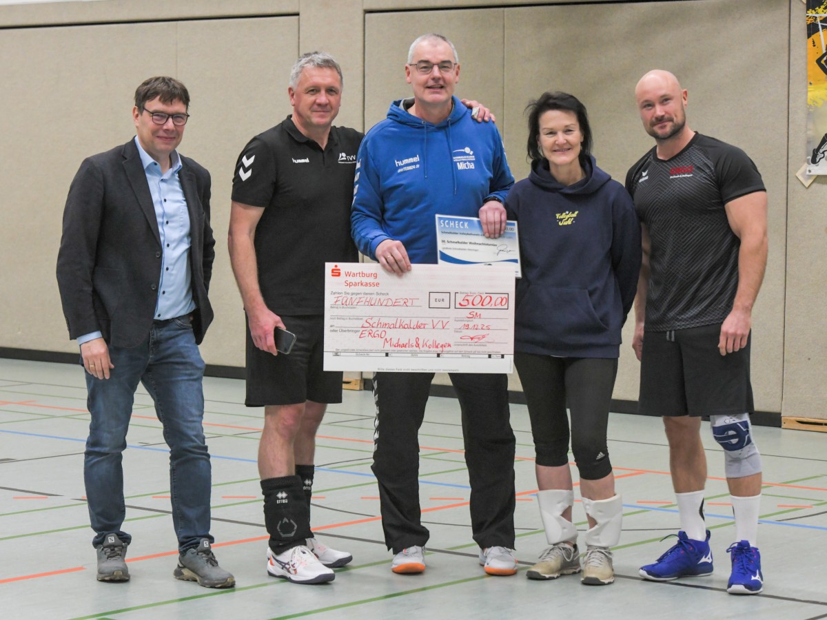 „Das Ziel lautet: Spaß haben“, fasste FSV-Fußballer Fiete Müller das Motto des Abends, aber eigentlich des gesamten Wochenendes zusammen. Nach herzlichen Worten der Begrüßung vom Micha Henke, Christian Stückrad (Präsident des Thüringer Volleyball-Verbandes), Schmalkaldens Bürgermeister Thomas Kaminski und Landrätin Peggy Greiser, ein paar Gastgeschenken für den Schmalkalder VV sowie einem kleinen Weihnachtsständchen aller Anwesenden ging es in vier Staffeln zu je drei Teams ans Netz, wo sich so mancher durchaus ehrgeizig zeigte. „Wir sind hier nicht angetreten, um Letzter zu werden. Das wurden wir früher oft genug“, zeigte sich Mario Liebaug vom Fußball-Schiedsrichterteam des KFA Rhön-Rennsteig ambitioniert. Am Ende erreichten sie immerhin Platz drei.