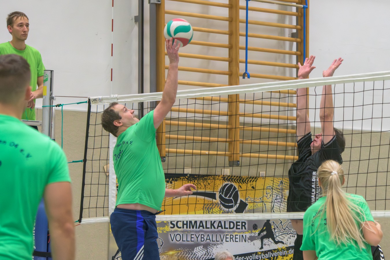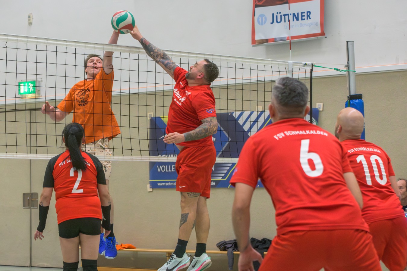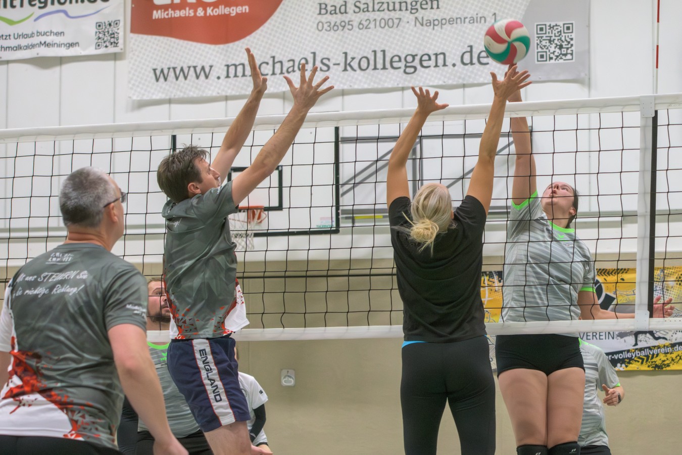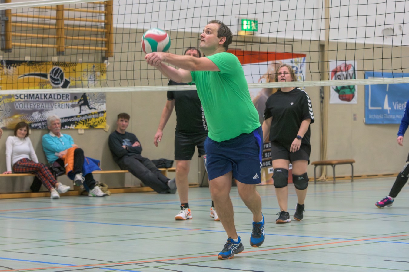 „Das Ziel lautet: Spaß haben“, fasste FSV-Fußballer Fiete Müller das Motto des Abends, aber eigentlich des gesamten Wochenendes zusammen. Nach herzlichen Worten der Begrüßung vom Micha Henke, Christian Stückrad (Präsident des Thüringer Volleyball-Verbandes), Schmalkaldens Bürgermeister Thomas Kaminski und Landrätin Peggy Greiser, ein paar Gastgeschenken für den Schmalkalder VV sowie einem kleinen Weihnachtsständchen aller Anwesenden ging es in vier Staffeln zu je drei Teams ans Netz, wo sich so mancher durchaus ehrgeizig zeigte. „Wir sind hier nicht angetreten, um Letzter zu werden. Das wurden wir früher oft genug“, zeigte sich Mario Liebaug vom Fußball-Schiedsrichterteam des KFA Rhön-Rennsteig ambitioniert. Am Ende erreichten sie immerhin Platz drei.