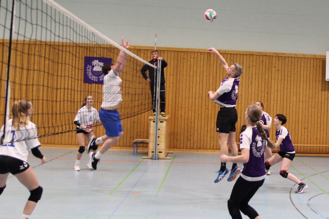 Der erste Satz verlief noch relativ ausgeglichen. Die Führung wechselte ständig. Abstimmungsfehler auf Seiten der Jugend ließen immer wieder einfache Punkte für die Gastgeber zu. Der erste Durchgang ging mit 25:23 knapp an die Schmalibus.