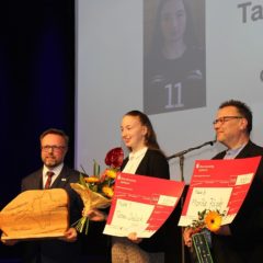 Dann folgten die großen Momente des Nachwuchses. Die Moderatoren Petra Kühn – bekannt als eine der Stimmen im Rennsteiglauf-Ziel Schmiedefeld – und Niclas Fuchs – Stadionsprecher beim Biathlon-Weltcup in Oberhof – bauten den Spannungsbogen bei jeder der fünf Ehrungen grandios auf. Nachdem alle Nominierten genannt wurden, baten sie die ersten drei zur Ehrung auf die Bühne. Die Schmalkalder Volleyballerin Tabea Dreiack durfte sich über den Sieg zur „Besten Nachwuchsportlerin 2024“ freuen. Und die Sportlerin des Jahres war von ihrem Sieg überwältigt. „Das ist irgendwie surreal. Ich hatte mich riesig gefreut, überhaupt nominiert zu sein und niemals damit gerechnet, dass ich gewinne“, so die 17-Jährige, die das Erfurter Sportgymnasium besucht. Die beim Schmalkalder VV groß gewordene Volleyballerin hat eine beachtliche Entwicklung hinter sich im vergangenen Jahr. „Für mich hat sich im vergangenen Jahr sehr viel verändert. Ich habe für Erfurt zweite Bundesliga gespielt, trainiere mittlerweile jeden Tag“, berichtet sie. „Ich bin sehr froh darüber, wie es sportliche gerade läuft bei mir und sehr gespannt, wie es jetzt weitergeht.“ Seinen Stolz konnte auch der Schmalkalder „Volleyball-Vater“ Michael Henke nicht verbergen. Und er hatte ja noch ein weiteres Mal viel Grund zum Jubeln. Denn seine Schützlinge von der weiblichen U14 holten sich den Titel als „Nachwuchs-Mannschaft des Jahres 2024“. Sie setzten sich vor der U13-Mannschaft des ESV Lok Meiningen durch. Die Mädchenfußballerinnen um Trainer Hans-Jürgen Herbst verwiesen das Nachwuchs-Schwimmteam der Meininger Wasserfreunde auf den dritten Platz.